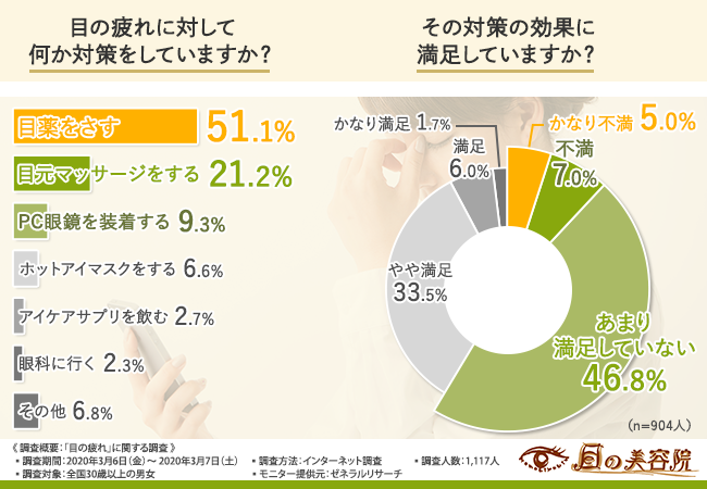目薬や目元マッサージ、PC眼鏡といったその場で手軽にできるもので対策していることが分かりました。