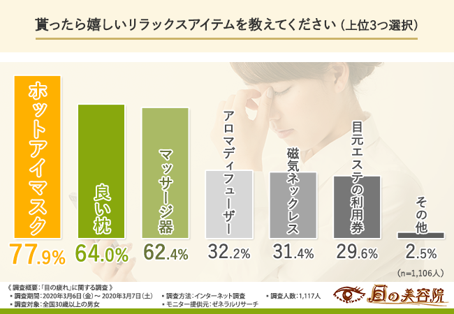先ほどの調査で8割以上の方が「目が疲れている」と回答しましたが、貰ったら嬉しいリラックスアイテムは何なのでしょうか?