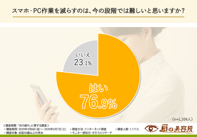 「スマホ・PC作業を減らすのは、今の段階では難しいと思いますか?」と質問したところ、8割近くの方が『はい(76.9%)』と回答しました。
